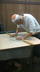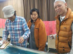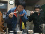「めがねいらない?」 リビングに連れて行かれ、一人遊びをはじめる、のぶくん。 とっくん放置。 それを見てお父さんがコーヒーを入れてくれたのに、二度寝。 すれ違いの朝。 そんなことになっていると知らない我々は10時過ぎまで爆睡。 二日目 雀荘万里は土曜日ということもあり、午前中から大盛況。 その半分をカーテンで仕切り、その中で我々は手拭い作業の続き。 染織して手拭いサイズにカットされたサラシに柄を刷るのは一番楽しく緊張する。 乾かし、スチームアイロンをかけると色が抜けるのが喜びの瞬間。 洗濯し、乾かし、アイロンかけ、たたむ。 ×180枚 ÷3人 終わらない。 ほしやんは雀荘の店番で大慌て。 みうらきゅんは結婚式の衣裳作りで大忙し。 あっという間に夜になり、トントントントン音がする。 ほしやんがそばをうっている。 厨房で立ち食いそば屋が開店。 本日のメニューは もちろんほしやんのそばと、季節の野菜の天ぷら。 ざるに少量のそばがもられ、焼津産の鰹節で出汁を取ったしっかりすっきりしたつゆにつけてペロリと完食。 そばの替え玉とは聞いたことないが、先程の倍の量のそばが盛られる。 まいたけ、白菜の菜の花、ふきのとう、ゼンマイ、ウルイ、などなど、天ぷらにして食べた。 カラリと揚げるにはどうしたら良いか苦戦してる様子。 そうこうしている間にとっくんが柏から、同級生とは思えない地元の高校生みたいなベビーフェイスの石黒くんと、カロリーメイトしか食べないと噂のバイク屋の山田さんを連れて来る。 46歳、テレクラで童貞を捨てたばかりの山田さんワールドに全員がはまり、3人が柏に帰った後も、余韻が残る~。 勝手に焼津・柏の姉妹都市宣言! 作業再開。 手拭い180枚全部刷り終わる。 ここからがお楽しみ。 Tシャツ・パーカー・ズボン・スパッツ、バーバリーのジャージにプリント。 今夜は万里に宿泊。 焼津には三つの酔いがある。 二つ目は……酒酔い のぞみ PR
