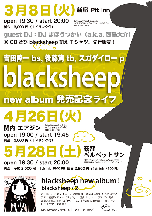 ご家族も無事ですか? NHKの放送がインターネットでも見られるようです。 USTREAM(www.ustream.tv/channel/nhk-gtv) ニコニコ動画(http://live.nicovideo.jp/watch/lv43018790) Googleでは地震の速報、安否確認、運行状況が見られます。 www.google.co.jp/intl/ja/crisisresponse/japanquake2011.html また余震があるかもしれないので、 落ち着いて行動してください。 井上のぞみ 3月8日セカンドアルバムblack sheep②のレコ発ライブがpit innでありました ゲストはDJまほうつかい(ジャケットの漫画を描いた西島大介先生)でした JAZZ小屋でXJAPANを流しちゃう大胆な選曲 普通なら絶対あり得ない ![]() 会場にはジャケットのメェ~ドの羊子(ようこ)ちゃんと、黒執事がお出迎え ![]() ![]() マンガ通りのシルエットの衣裳を作るのに約一ヶ月![]() ![]() かなり好評でよかったよ~![]() 会場中が萌え~ 陽くんが来てくれました。ありがとう 陽くんもライブ絶賛! ついつい飲み過ぎました~ ![]() 次回ライブは 4月26日(火)関内エアジン、 5月28日(土)荻窪velvet sun CD2,310円 doubtmusicから発売中!!ファーストアルバムも絶賛発売中! 羊子ちゃんTシャツはピンク、黄色、黒の3色、アメリカンサイズで150、SMLの4サイズ。 グッズを作ったり、ひつじさんでライブに行ったりと盛り上げていこうかと思います ![]() ![]() バンドではないんですよ。 目を閉じると 吉田隆一の世界観がビジュアルで広がって来るんです。 宇宙の広さ、温度まで感じ音楽なんです。 まるで3D映画を見てるような感覚です。 CDの完成度も高いし、ライブも絶対裏切らないです。 だから何かのカタチで関わりたい。 ライブを成功させたい。 みんなに聞いてもらいたいって思っちゃうんだよね。 好きかどうかわからないけど、まずはライブに足を運んでもらえたら幸いです ![]() ![]() 来い!買え!着ろ! のぞみ☆彡