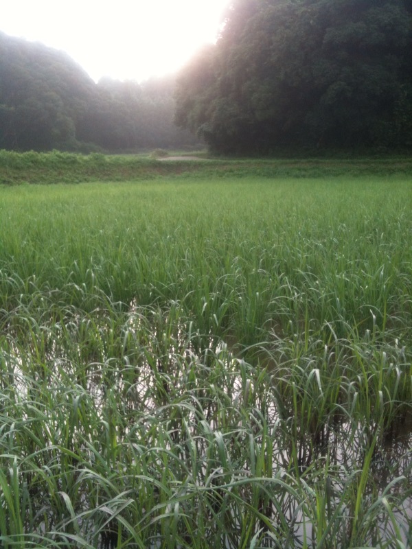 いのをひとつ借りて米をつくって遊んでいる。 このまえは苗を植えた。 今回はまわりに生えてくる雑草をとる。(とらないと土の栄養をと られてしまいおいしい米ができないらしい) 汗をかく。普段なかなかしない動きや姿勢で一日中草むしり。途中、疲れ たりしたけど休んだり、昼ごはんを作ったり、昼寝をしたりとのんびりと 一日をゆっくり長く使っていく。 苗は会うたびにすくすく育っている。 自分たちで育てた米はきっとおいしいんだろうなぁ。実験的に古代米って のも少し植えてみた。 素足で入るどろんこは気持ちがいい。 なんでも人がたんぼに入ると日で熱くなりすぎた水がかきまわされて冷た い水がまざるからいいらしい。 踏んだ足跡が水の中に残っていく。 底に出来たくぼみは虫達が涼めるいい空間になるらしい。 今朝、早起きをした。ひさびさに霧をみている。ちょうどみたいなぁと 思っていたからなんだか嬉しい。 少しぼやけた景色と輪郭。 さっ。準備をしたら原宿に向かうかーっ。今日はのぞみさんに声をかけら れて、何人かでとっくんデザインのユニクロTシャツを買いにいく らしい。 そのあとは稽古。今日はとっくんTシャツを稽古着に使ってみよう と思う。 げん