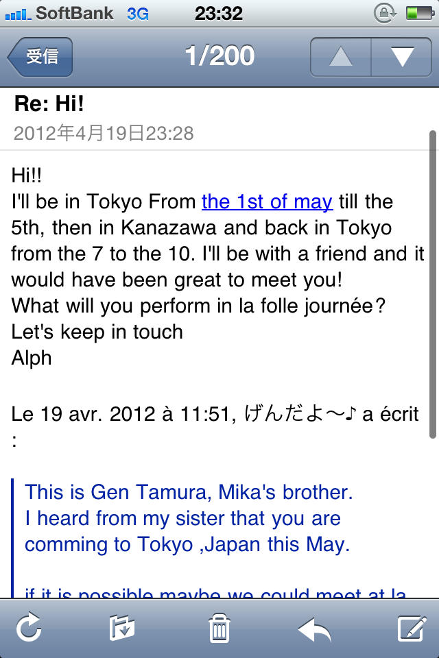 その時はクリウィムバァニーというダンスカンパニー。その時の公演は長谷川宝子さんも踊るというので行きたかったけれど、行かれなかった。 だから今日、行ってきた。 そしたらjimanica band set さんってバンドが生演奏。ドラマーが2人いる。 女性の方は前田紗希さん。 実はねねむワークショップにも来てくれたことがあった。(というか、実はねねむはワークショップをやっていた?笑) 実は正月の神田の企画でも仕込みのときに皆が踊る3階の部屋をなぐりを片手にせっせと白い布をはってくれていた。 その時は前田紗希もjimanicaさんのバンドには入っていなかったけれど。 【先がどうなるなんかはわからない。 「告知ってしてみるもんだ。」】 今日、電車にのってたら突然メールが届いた。フランスへ嫁いでいった姉からの。距離があろうがなかろうがこのあいだ告知をしたその返事。 「フランスの友達があなたと同じラ フォル ジュルネで演奏しに東京へ行くから、よろしく。」 アルフォンス スマンさんというピアニストらしい。しかも同日の5/3日だ。。。 さっそく、スマンさんに忘れかけている英語でメールをしてみた。 皆、「げんちゃんそういうの得意だねー」なんて言ってくるけれどね。内心は不安だらけでただこっちは必死なだけなんだけどね。って言いたくなる。 すまん。 スマン http://www.lfj.jp/lfj_2012/artist/detail/art_51.html |